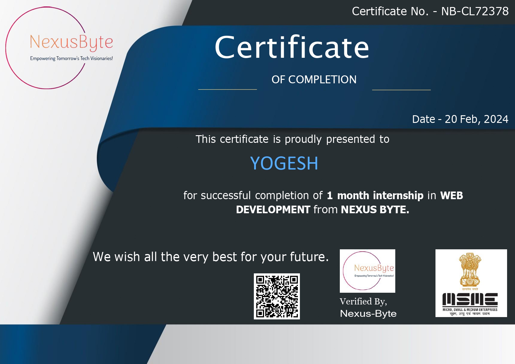 This internship was certified by Nexus Byte, with recognition from the Micro, Small & Medium Enterprises (MSME) ministry, validating the quality and relevance of the training.